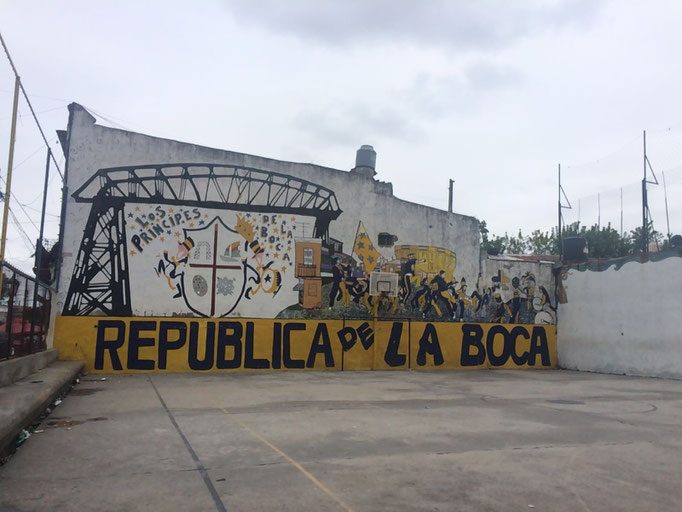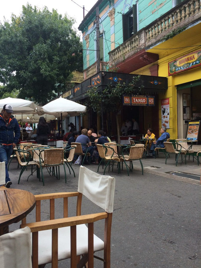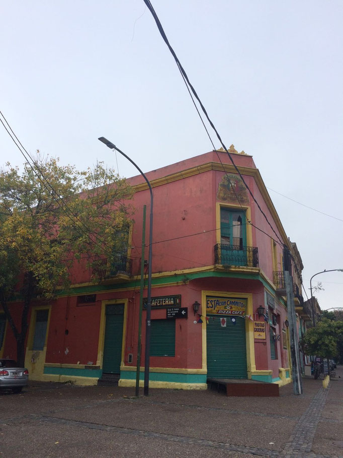 Die alten Häuser und bunten Fassaden sind aus La Boca, dem alten Viertel von Buenos Aires, überall Straßencafés und Musik....